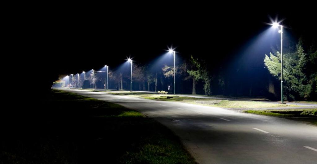 A solar streetlight uses a solar panel to charge a battery during the day. At night, the stored energy powers an LED lamp, automatically turning on at dusk and off at dawn using a light sensor or controller.